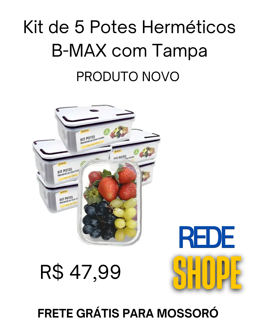 Trata-se de um kit de 5 potes herméticos de plástico B-MAX (modelo BM-F1037).