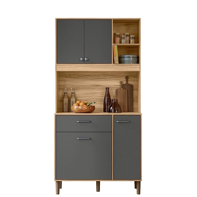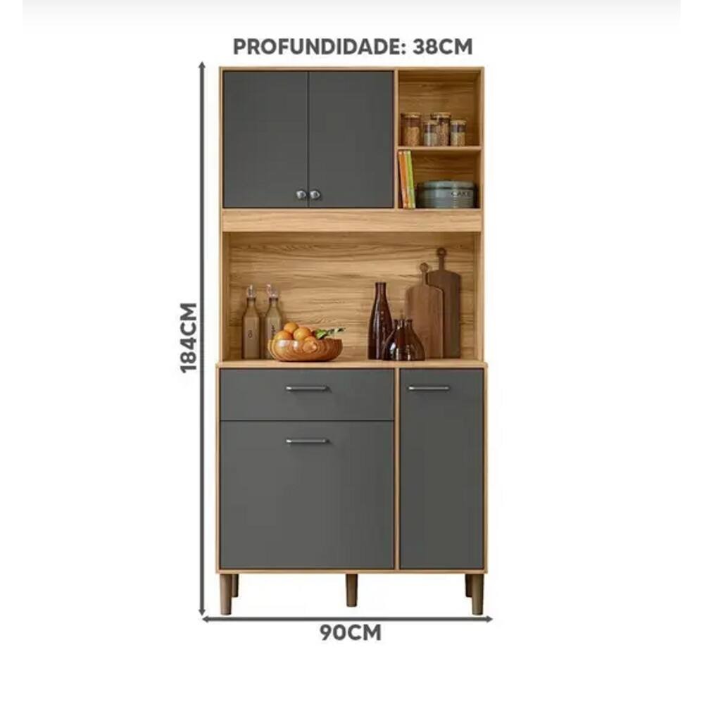 - É um armário para cozinha pequena com 4 portas e 1 gaveta.