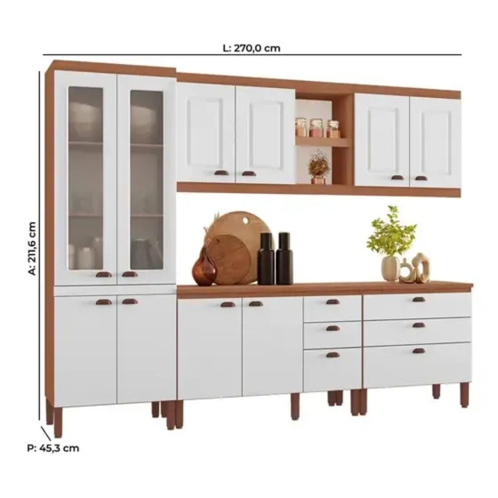 - Design: O estilo combina o charme do amadeirado claro com a modernidade dos tons neutros, criando um ambiente acolhedor e funcional. O estilo das portas superiores pode ser descrito como provençal ou clássico.