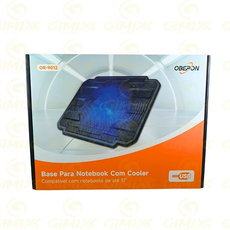 . A imagem mostra uma base para notebook com cooler da marca Oberon.