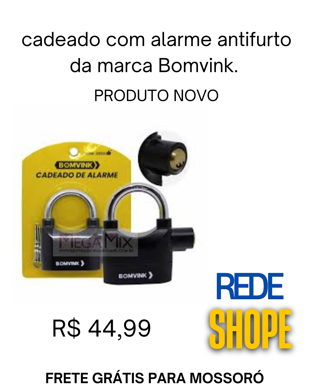 Trata-se de um cadeado com alarme sonoro anti-furto da marca Bomvink.