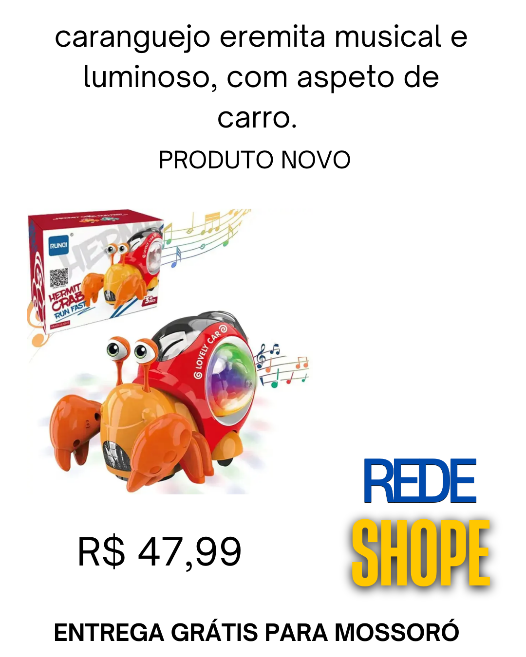Trata-se de um brinquedo de caranguejo eremita musical e luminoso com função “bate e volta”.