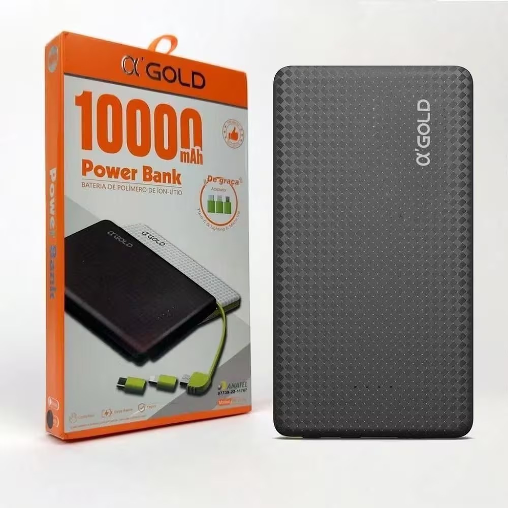Trata-se de um carregador portátil (power bank) A’gold de 10.000 mAh.