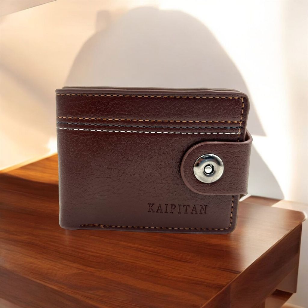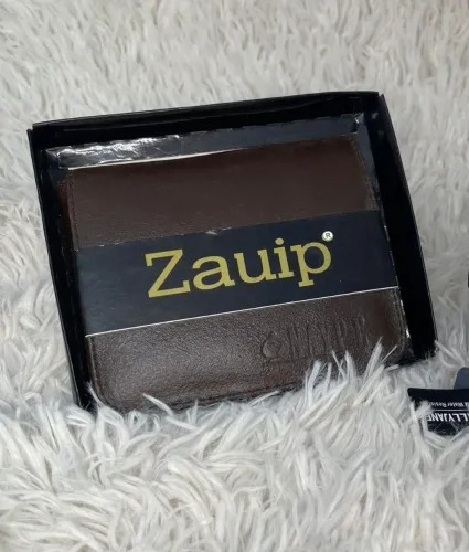 A carteira masculina da imagem é da marca Kaipitan, especificamente um modelo em couro sintético com fechamento em zíper. A imagem de contexto menciona o nome Zauip