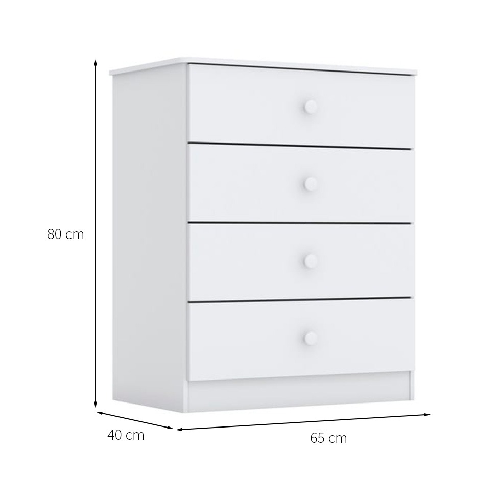 A cômoda branca de 4 gavetas é um item de mobília comum indicado para quarto infantil.