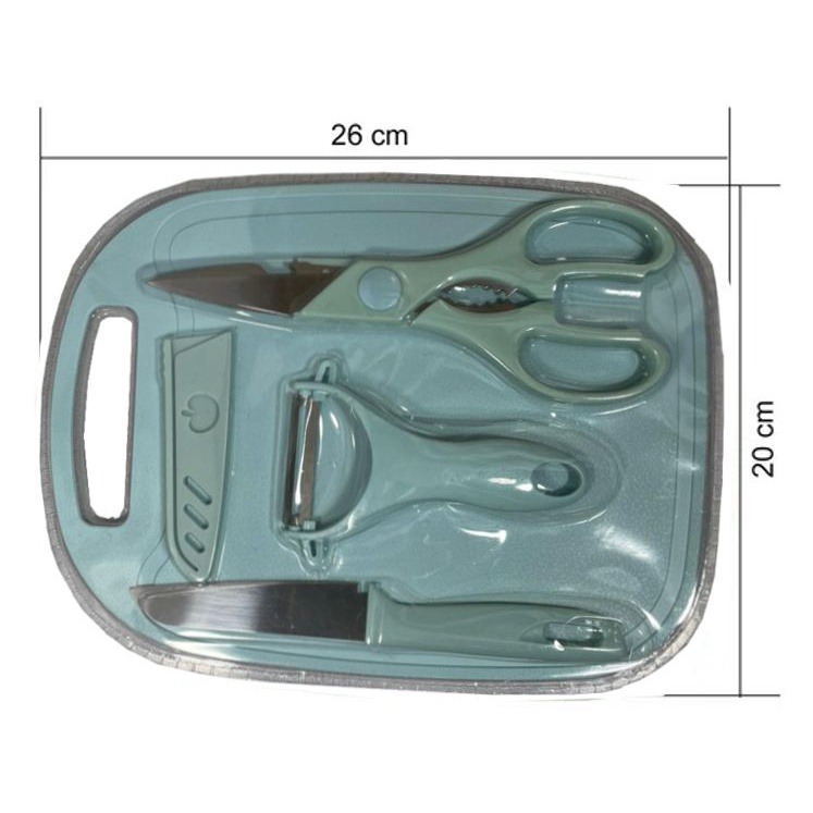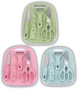 - Conteúdo: Inclui uma tesoura, um descascador e uma tábua de cortar.