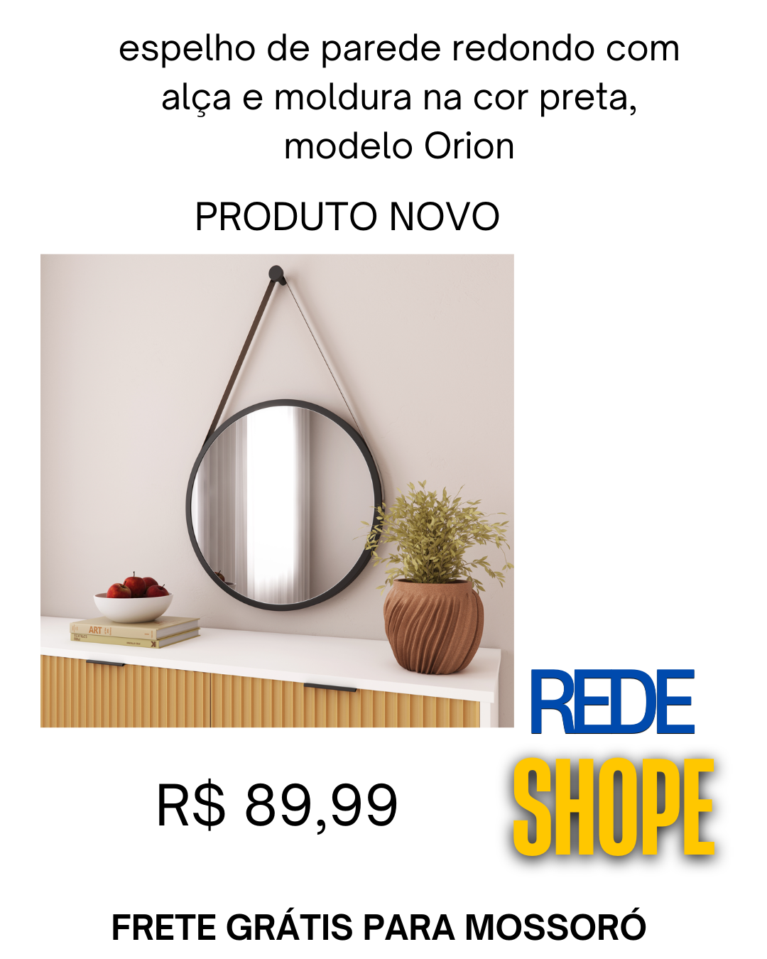 Este é um espelho de parede redondo OH-5238 preto com uma alça removível em revestimento sintético.