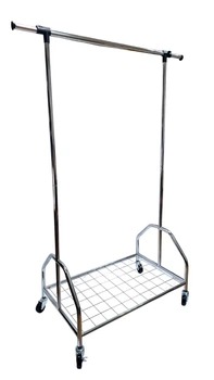 Trata-se de um expositor de araras de roupas de polo único em caixas.