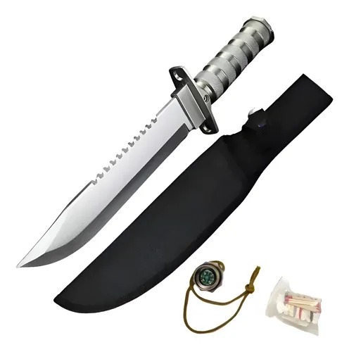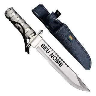 As facas exibidas são modelos táticos e de sobrevivência, inspirados no estilo Rambo, e estão disponíveis para compra em diversos varejistas online