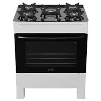 O fogão na imagem é o modelo Fogão 5 Bocas a Gás Acendimento Automático Realce Glass Bivolt CR212. Ele é conhecido por seu design sofisticado, com mesa de vidro temperado e acabamento branco que combina elegância e funcionalidade.