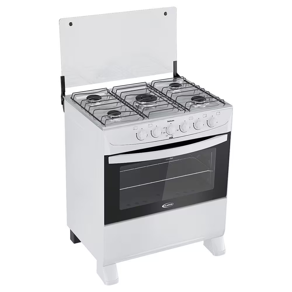 O objeto na imagem é um fogão a gás branco de 5 bocas com mesa de vidro.