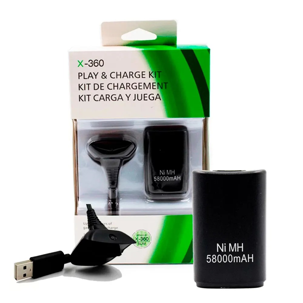 O item na imagem é um Kit Play & Charge para Xbox 360, especificamente o modelo M-5709, que inclui uma bateria recarregável e um cabo USB.