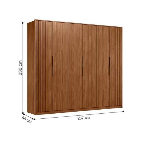 O guarda-roupa na imagem é o modelo Atrice da marca Demóbile. Ele é um guarda-roupa de casal com 6 portas ripadas e 6 gavetas na cor Nogueira Touch.
