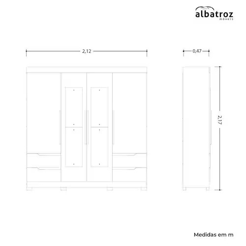 - Dimensões aproximadas: 2,17m (altura) x 2,12m (largura) x 0,47m (profundidade)