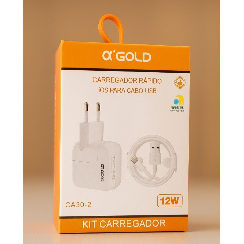 O item é um kit de carregador rápido A’Gold CA30-2 para dispositivos iOS.