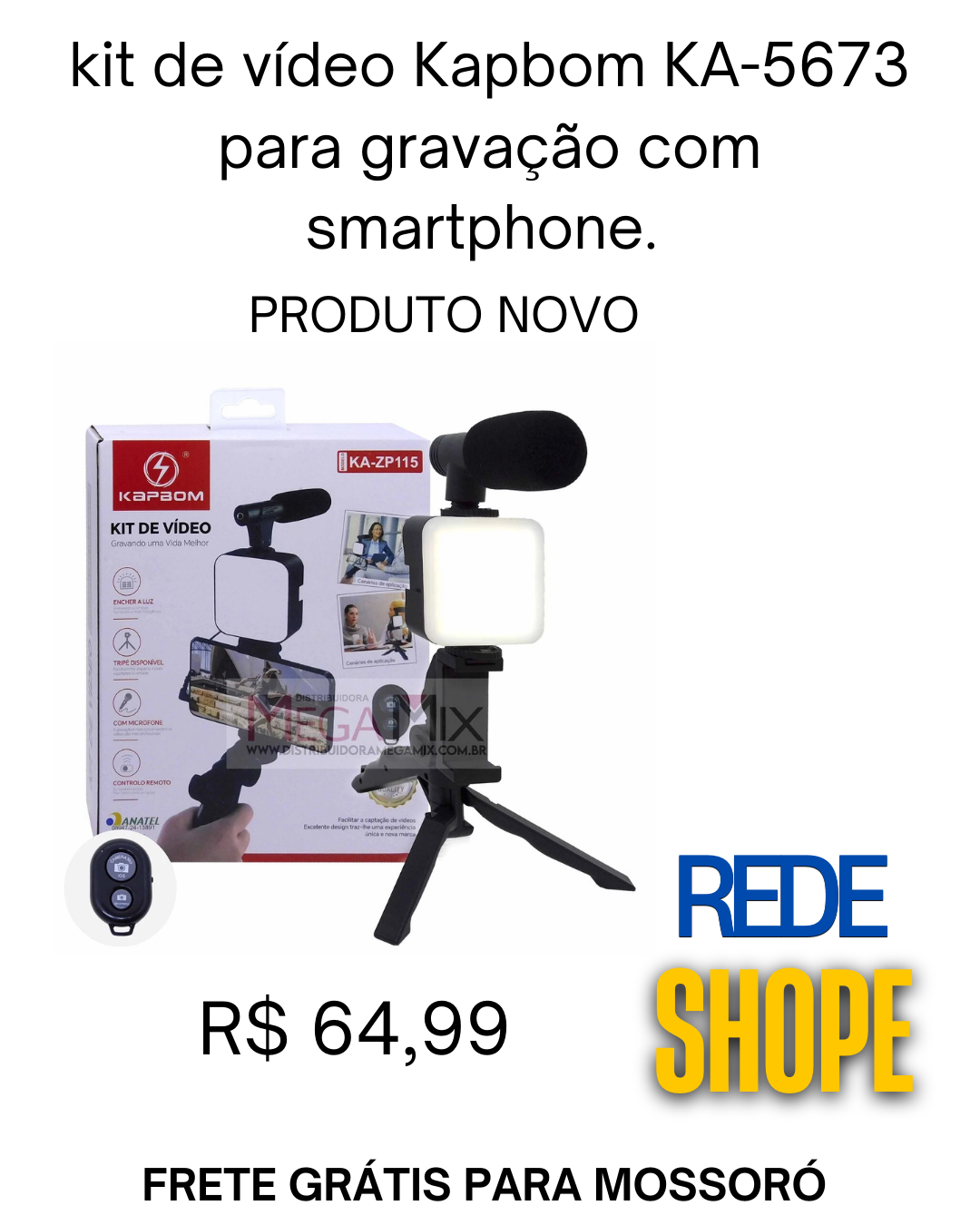 O item é um Kit de Vídeo Kapbom KA-5673, um estabilizador com luz LED, microfone e tripé para telemóveis, ideal para streaming, podcasts e criação de conteúdo.
