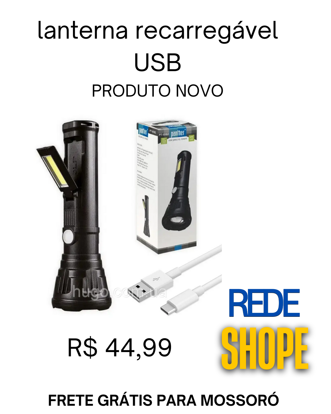 - Cores disponíveis: A lanterna é preta e emite luz branca fria