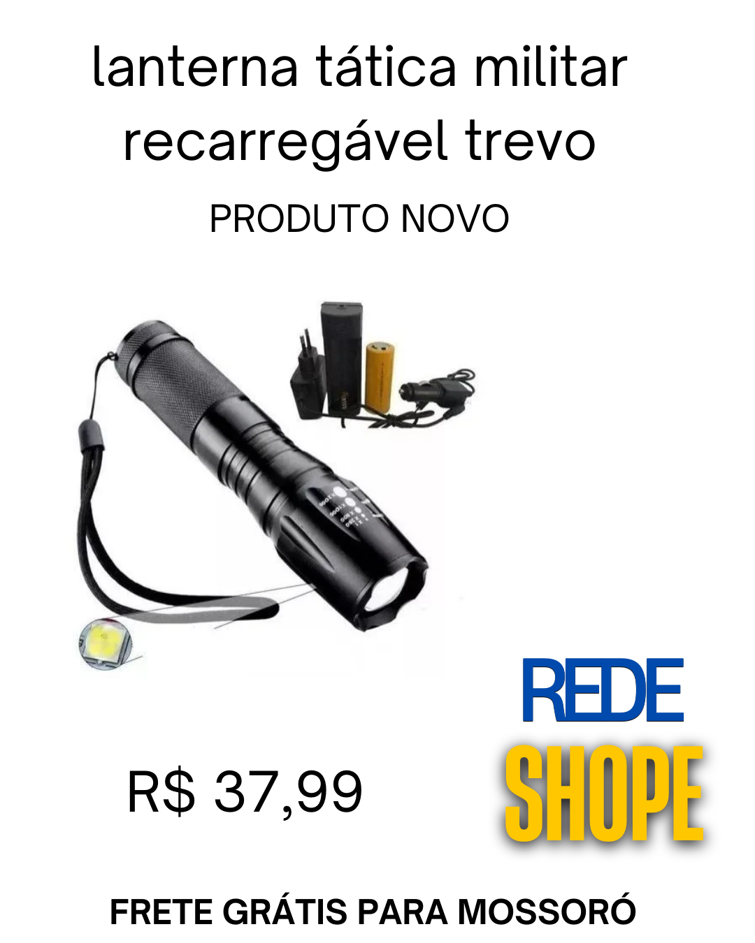 O objeto principal na imagem é uma Lanterna Tática Militar X900 recarregável da marca Trevo.