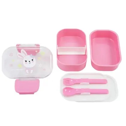 Trata-se de uma marmita lancheira infantil com divisórias e talheres, na cor rosa, com estampa de ursinho e laço.