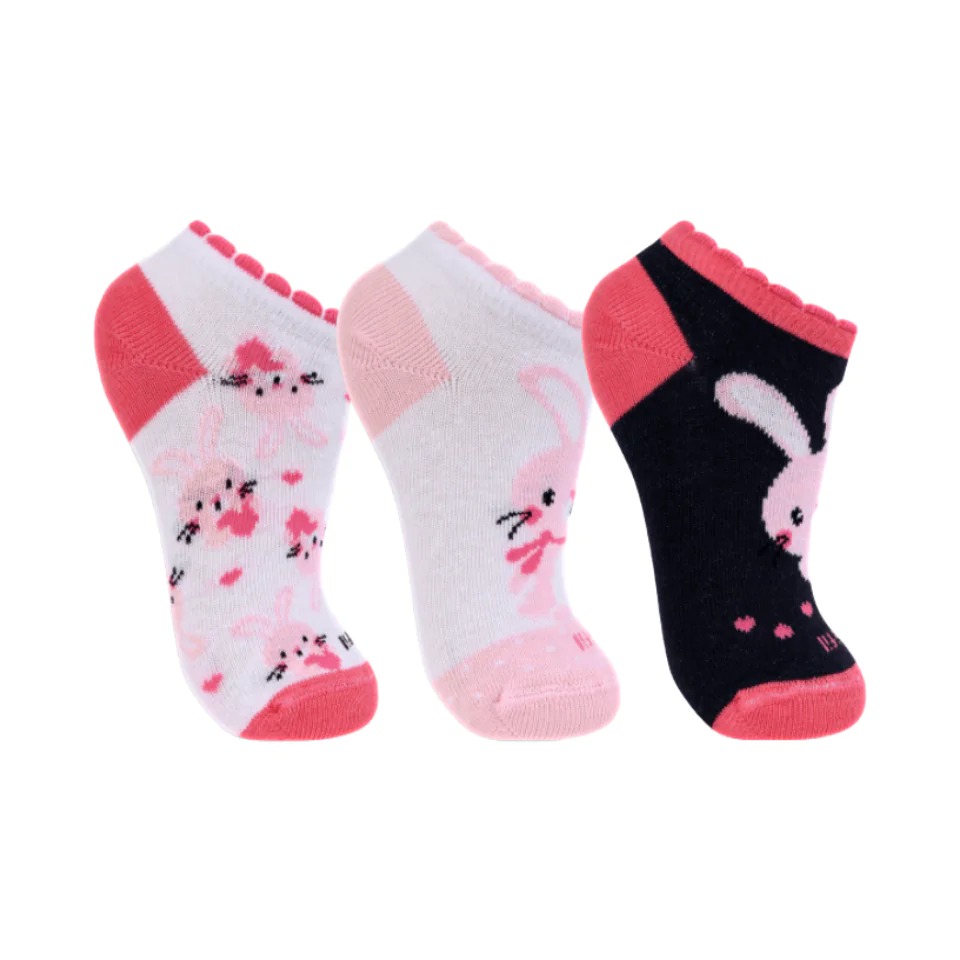 As meias mostradas na imagem são meias infantis estampadas. Elas apresentam desenhos sortidos, como estrelas na meia preta e um rosto com olhos e boca na meia rosa, e o tamanho indicado na embalagem é 10-12