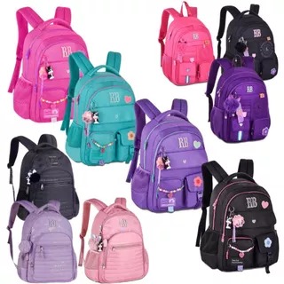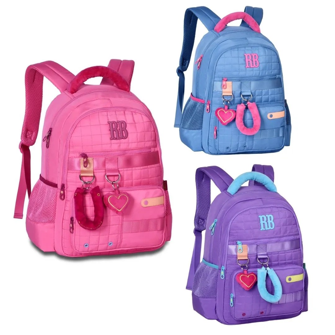 A mochila em destaque na imagem é um modelo da marca Rebecca Bonbon, especificamente identificada em pesquisas como parte da linha RB3114. É um modelo popular de mochila escolar feminina, frequentemente disponível em diversas cores, incluindo a roxa e rosa visíveis na foto.