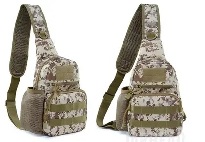 - Características:A mochila possui um padrão camuflado digital em tons de cinza e bege, e vários compartimentos com fechos de zíper visíveis.