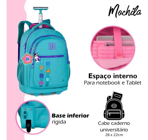 - Tamanho:As mochilas de rodinhas têm medidas aproximadas de 48x33x19 cm, ideais para materiais escolares grandes como cadernos e livros.