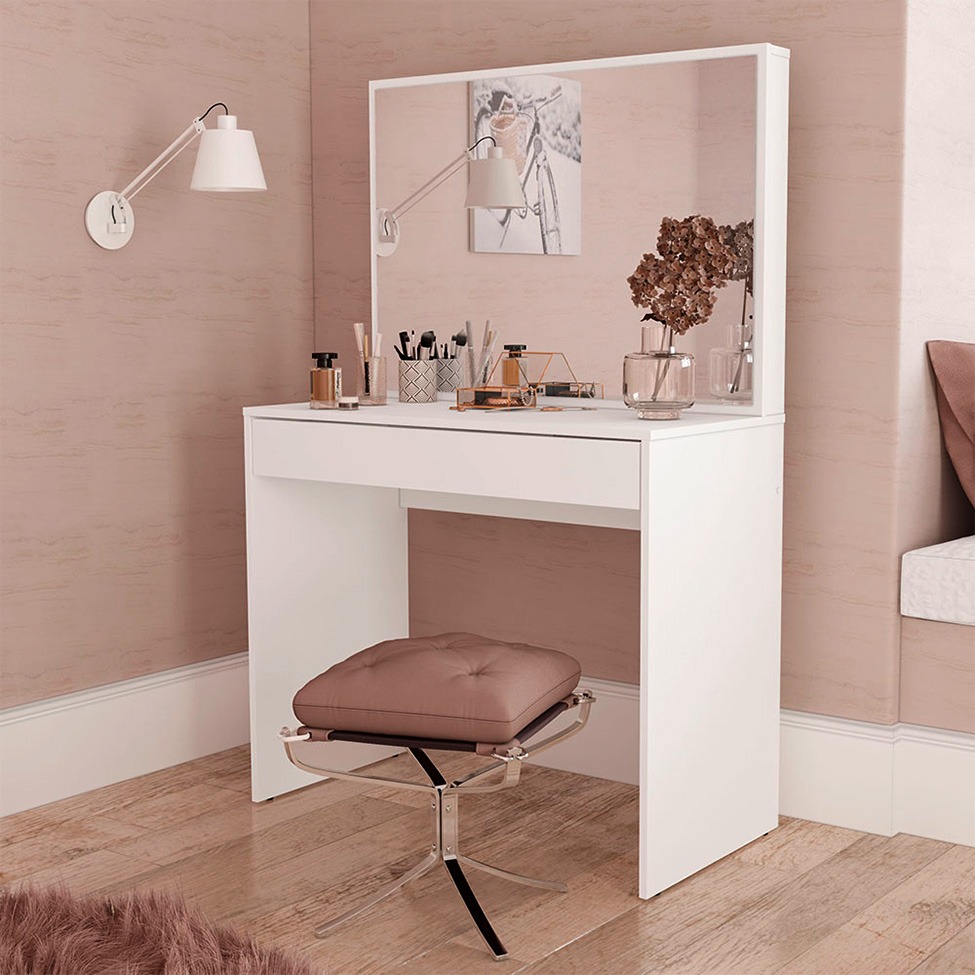 penteadeira camarim branca com espelho e iluminação embutida.