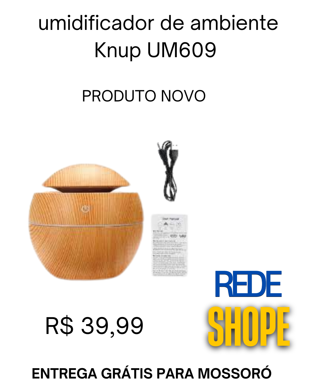 Este é um umidificador de ambiente da marca Knup, modelo UM609. O aparelho liberta vapor de água no ambiente, aumentando a humidade relativa do ar.