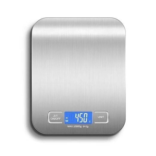 A balança na imagem é uma balança de cozinha digital de alta precisão, geralmente vendida sob várias marcas genéricas, como ZT Digital Food Scale ou New’Ion. Ela é feita de aço inoxidável e tem capacidade máxima de pesagem de 10 kg, com precisão de 1 grama.