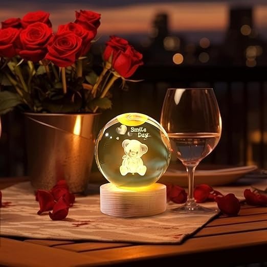- Design:Possui uma esfera de cristal com um ursinho dourado em 3D no interior, sobre uma base.