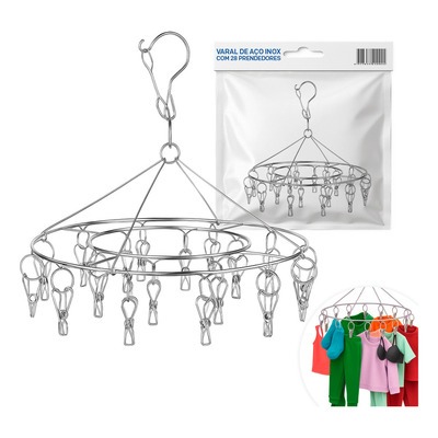O objeto na imagem é um varal de roupas redondo de aço inoxidável, também conhecido como cabide circular ou varal para peças íntimas. É um acessório prático de lavanderia projetado para secar itens pequenos e delicados.